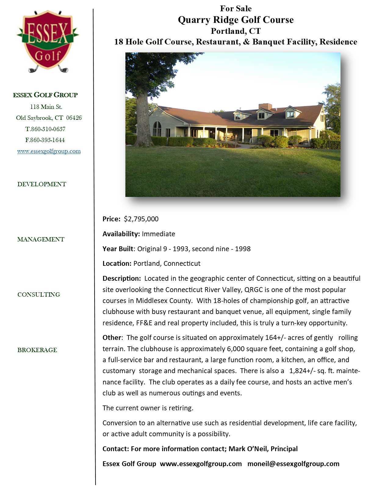 Quarry Ridge Golf Course: Perched atop one of the highest locations in Central Connecticut, Quarry Ridge Golf Course is an 18-hole championship layout that has been popular with players from both CT and Massachusetts. Located in the town of Portland, the course is situated in the geographic center of the state. Portland is bordered by the affluent community of Glastonbury to the north, and the Connecticut River to the west, and by the city of Middletown to the south. Property also includes a small residence and several potential building lots. $2,795,000 SOLD