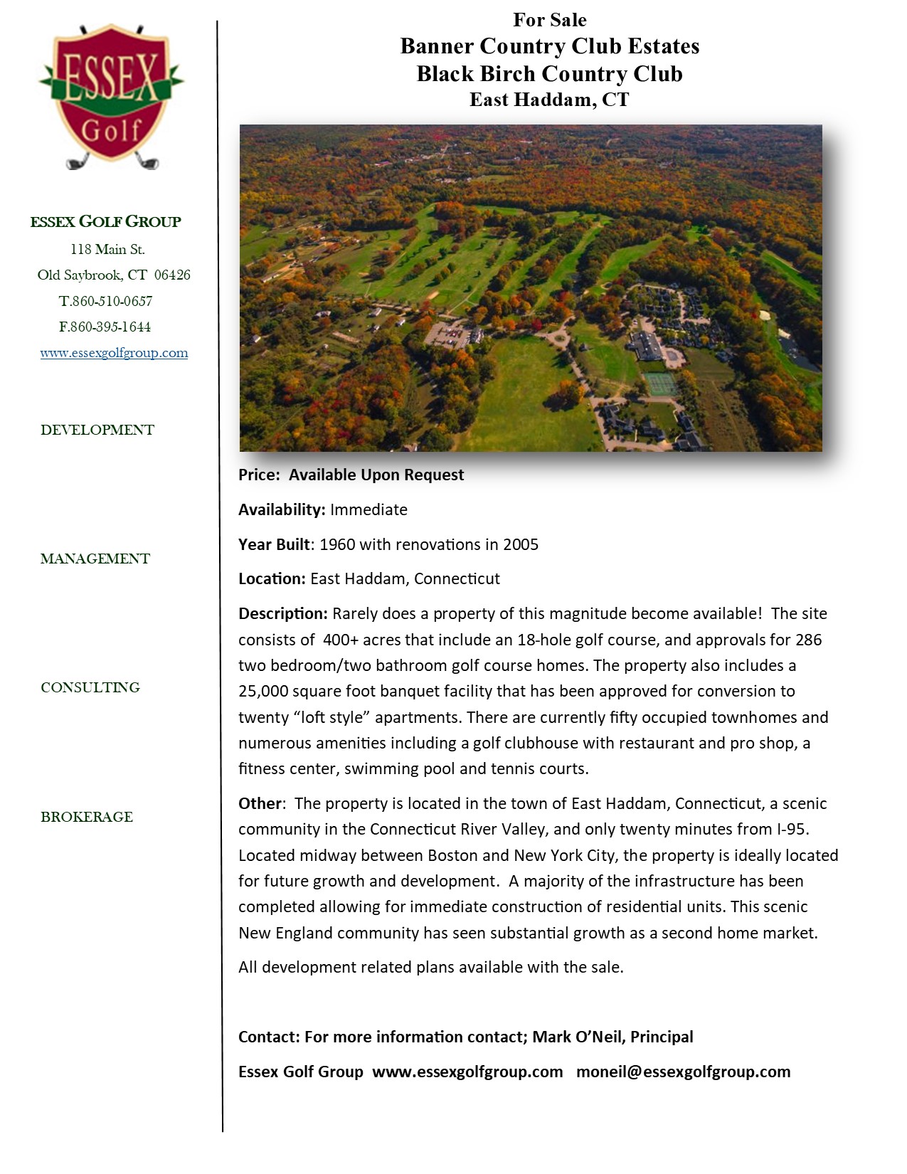 Banner Estates and Black Birch Country Club: Rare offering of large development track in CT. 400+ acres with approvals in place for 300+/- homes. 18-hole golf course and other amenities included. Located in East Haddam, Connecticut River Valley and less than thirty minutes of I-95. OFF MARKET